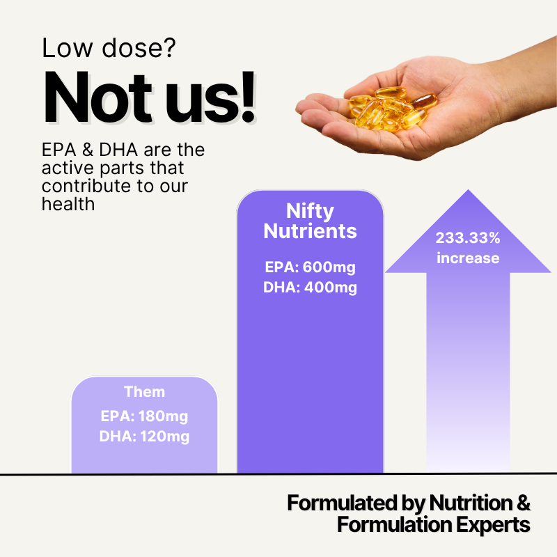 Two softgels contain 1000mg of Omega 3, of which 600mg is EPA and 400mg is DHA, the most important types of Omega 3.